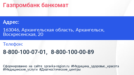 Газпромбанк, банкомат по адресу 163046, Архангельская область, Архангельск, Воскресенская, 20 в дальнейшем Организация, размещена в следующих категориях:
