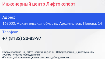 Инженерный центр Лифтэксперт по адресу 163000, Архангельская область, Архангельск, Попова, 14 в дальнейшем Организация, размещена в следующих категориях: