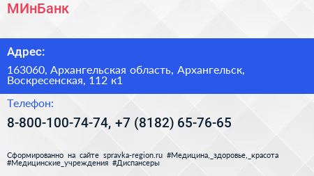 МИнБанк по адресу 163060, Архангельская область, Архангельск, Воскресенская, 112 к1 в дальнейшем Организация, размещена в следующих категориях: