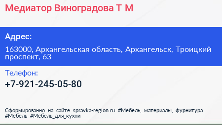 Медиатор Виноградова Т.М. по адресу 163000, Архангельская область, Архангельск, Троицкий проспект, 63 в дальнейшем Организация, размещена в следующих категориях: