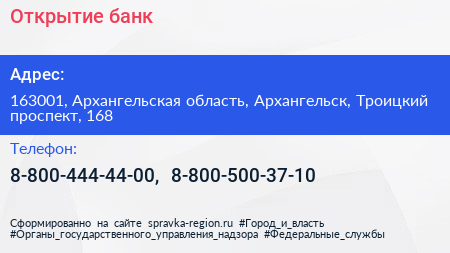 Открытие, банк по адресу 163001, Архангельская область, Архангельск, Троицкий проспект, 168 в дальнейшем Организация, размещена в следующих категориях: