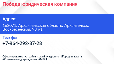 Победа, юридическая компания по адресу 163071, Архангельская область, Архангельск, Воскресенская, 93 к1 в дальнейшем Организация, размещена в следующих категориях: