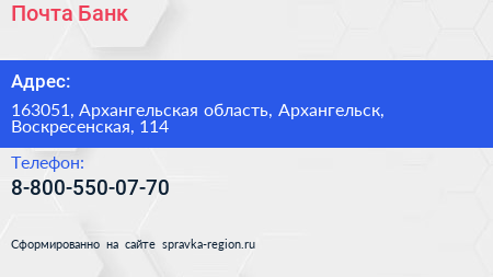 Почта Банк по адресу 163051, Архангельская область, Архангельск, Воскресенская, 114 в дальнейшем Организация, размещена в следующих категориях: