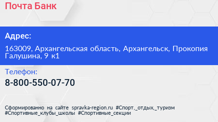 Почта Банк по адресу 163009, Архангельская область, Архангельск, Прокопия Галушина, 9 к1 в дальнейшем Организация, размещена в следующих категориях: