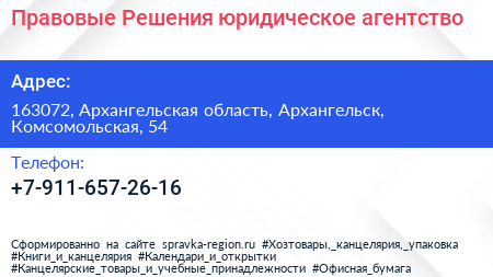Правовые Решения, юридическое агентство по адресу 163072, Архангельская область, Архангельск, Комсомольская, 54 в дальнейшем Организация, размещена в следующих категориях: