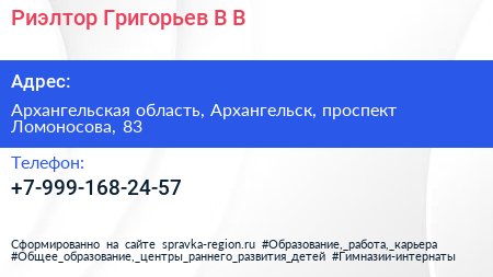 Риэлтор Григорьев В. В. по адресу Архангельская область, Архангельск, проспект Ломоносова, 83 в дальнейшем Организация, размещена в следующих категориях: