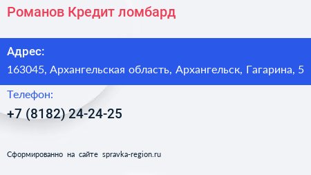 Романов Кредит, ломбард по адресу 163045, Архангельская область, Архангельск, Гагарина, 5 в дальнейшем Организация, размещена в следующих категориях: