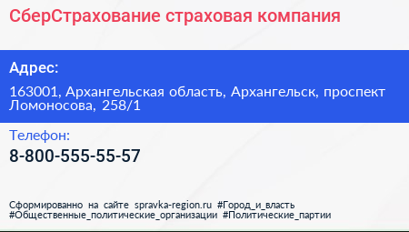 СберСтрахование, страховая компания по адресу 163001, Архангельская область, Архангельск, проспект Ломоносова, 258/1 в дальнейшем Организация, размещена в следующих категориях: