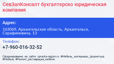СевЗапКонсалт, бухгалтерско-юридическая компания по адресу 163069, Архангельская область, Архангельск, Серафимовича, 13 в дальнейшем Организация, размещена в следующих категориях: