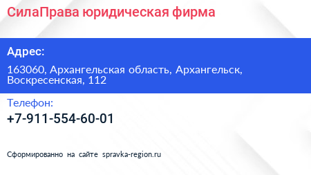 СилаПрава, юридическая фирма по адресу 163060, Архангельская область, Архангельск, Воскресенская, 112 в дальнейшем Организация, размещена в следующих категориях:
