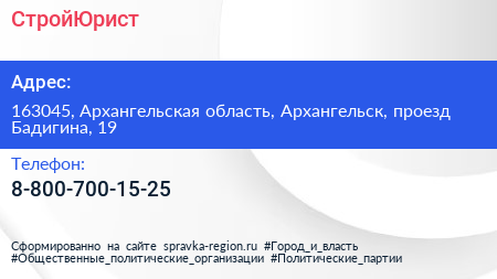 СтройЮрист по адресу 163045, Архангельская область, Архангельск, проезд Бадигина, 19 в дальнейшем Организация, размещена в следующих категориях: