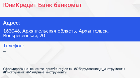 ЮниКредит Банк, банкомат по адресу 163046, Архангельская область, Архангельск, Воскресенская, 20 в дальнейшем Организация, размещена в следующих категориях: