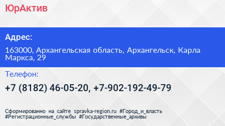 ЮрАктив по адресу 163000, Архангельская область, Архангельск, Карла Маркса, 29 в дальнейшем Организация, размещена в следующих категориях: