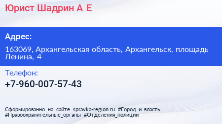 Юрист Шадрин А.Е. по адресу 163069, Архангельская область, Архангельск, площадь Ленина, 4 в дальнейшем Организация, размещена в следующих категориях: