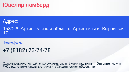 Ювелир, ломбард по адресу 163059, Архангельская область, Архангельск, Кировская, 17 в дальнейшем Организация, размещена в следующих категориях: