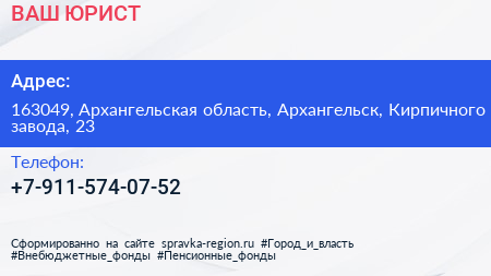 ВАШ ЮРИСТ по адресу 163049, Архангельская область, Архангельск, Кирпичного завода, 23 в дальнейшем Организация, размещена в следующих категориях: