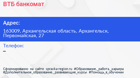 ВТБ, банкомат по адресу 163009, Архангельская область, Архангельск, Первомайская, 27 в дальнейшем Организация, размещена в следующих категориях: