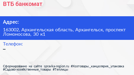 ВТБ, банкомат по адресу 163002, Архангельская область, Архангельск, проспект Ломоносова, 30 к1 в дальнейшем Организация, размещена в следующих категориях: