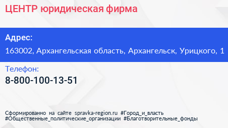 ЦЕНТР, юридическая фирма по адресу 163002, Архангельская область, Архангельск, Урицкого, 1 в дальнейшем Организация, размещена в следующих категориях: