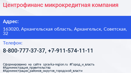Центрофинанс, микрокредитная компания по адресу 163020, Архангельская область, Архангельск, Советская, 32 в дальнейшем Организация, размещена в следующих категориях: