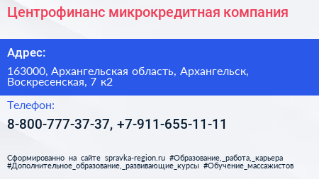 Центрофинанс, микрокредитная компания по адресу 163000, Архангельская область, Архангельск, Воскресенская, 7 к2 в дальнейшем Организация, размещена в следующих категориях: