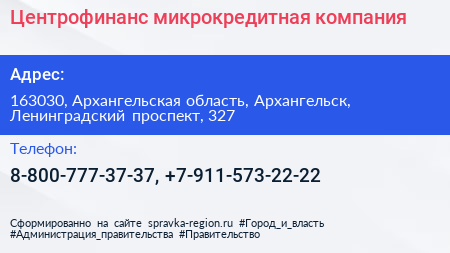 Центрофинанс, микрокредитная компания по адресу 163030, Архангельская область, Архангельск, Ленинградский проспект, 327 в дальнейшем Организация, размещена в следующих категориях: