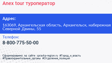Anex tour, туроператор по адресу 163069, Архангельская область, Архангельск, набережная Северной Двины, 55 в дальнейшем Организация, размещена в следующих категориях: