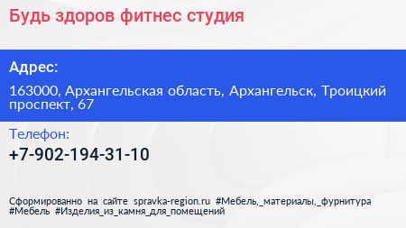 Будь здоров!, фитнес-студия по адресу 163000, Архангельская область, Архангельск, Троицкий проспект, 67 в дальнейшем Организация, размещена в следующих категориях: