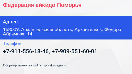 Федерация айкидо Поморья по адресу 163009, Архангельская область, Архангельск, Фёдора Абрамова, 14 в дальнейшем Организация, размещена в следующих категориях: