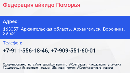 Федерация айкидо Поморья по адресу 163057, Архангельская область, Архангельск, Воронина, 29 к2 в дальнейшем Организация, размещена в следующих категориях: