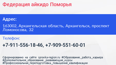 Федерация айкидо Поморья по адресу 163002, Архангельская область, Архангельск, проспект Ломоносова, 32 в дальнейшем Организация, размещена в следующих категориях: