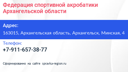 Федерация спортивной акробатики Архангельской области по адресу 163015, Архангельская область, Архангельск, Минская, 4 в дальнейшем Организация, размещена в следующих категориях: