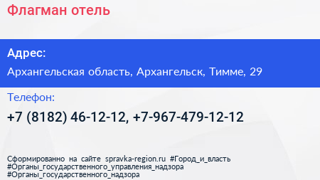 Флагман, отель по адресу Архангельская область, Архангельск, Тимме, 29 в дальнейшем Организация, размещена в следующих категориях: