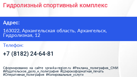 Гидролизный, спортивный комплекс по адресу 163022, Архангельская область, Архангельск, Гидролизная, 12 в дальнейшем Организация, размещена в следующих категориях: