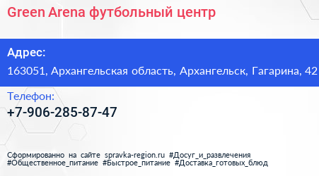 Green Arena, футбольный центр по адресу 163051, Архангельская область, Архангельск, Гагарина, 42 в дальнейшем Организация, размещена в следующих категориях: