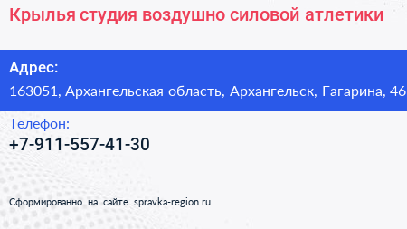 Крылья, студия воздушно-силовой атлетики по адресу 163051, Архангельская область, Архангельск, Гагарина, 46 в дальнейшем Организация, размещена в следующих категориях: