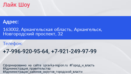 Лайк Шоу по адресу 163002, Архангельская область, Архангельск, Новгородский проспект, 32 в дальнейшем Организация, размещена в следующих категориях: