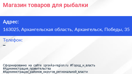 Магазин товаров для рыбалки по адресу 163025, Архангельская область, Архангельск, Победы, 35 в дальнейшем Организация, размещена в следующих категориях: