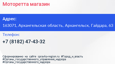 Моторетта, магазин по адресу 163071, Архангельская область, Архангельск, Гайдара, 63 в дальнейшем Организация, размещена в следующих категориях:
