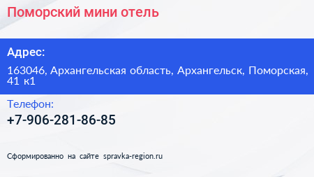 Поморский, мини-отель по адресу 163046, Архангельская область, Архангельск, Поморская, 41 к1 в дальнейшем Организация, размещена в следующих категориях: