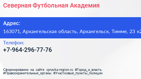 Северная Футбольная Академия по адресу 163071, Архангельская область, Архангельск, Тимме, 23 к2 в дальнейшем Организация, размещена в следующих категориях: