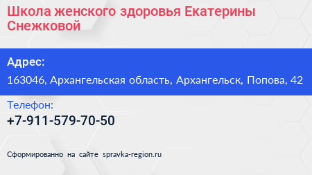Школа женского здоровья Екатерины Снежковой по адресу 163046, Архангельская область, Архангельск, Попова, 42 в дальнейшем Организация, размещена в следующих категориях: