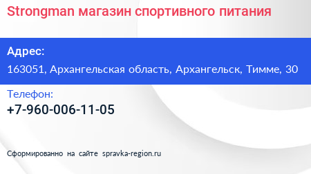 Strongman, магазин спортивного питания по адресу 163051, Архангельская область, Архангельск, Тимме, 30 в дальнейшем Организация, размещена в следующих категориях: