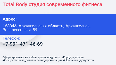 Total Body, студия современного фитнеса по адресу 163046, Архангельская область, Архангельск, Воскресенская, 59 в дальнейшем Организация, размещена в следующих категориях: