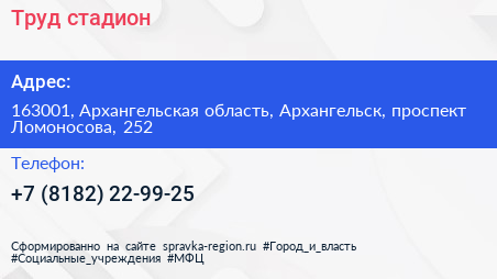 Труд, стадион по адресу 163001, Архангельская область, Архангельск, проспект Ломоносова, 252 в дальнейшем Организация, размещена в следующих категориях: