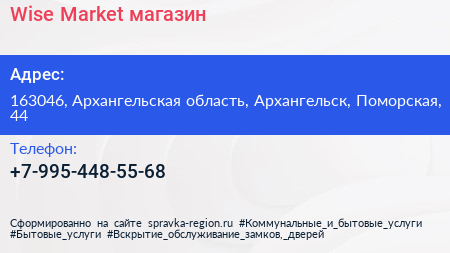 Wise Market, магазин по адресу 163046, Архангельская область, Архангельск, Поморская, 44 в дальнейшем Организация, размещена в следующих категориях: