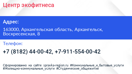 Центр экофитнеса по адресу 163000, Архангельская область, Архангельск, Воскресенская, 8 в дальнейшем Организация, размещена в следующих категориях:
