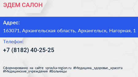 ЭДЕМ-САЛОН по адресу 163071, Архангельская область, Архангельск, Нагорная, 1 в дальнейшем Организация, размещена в следующих категориях: