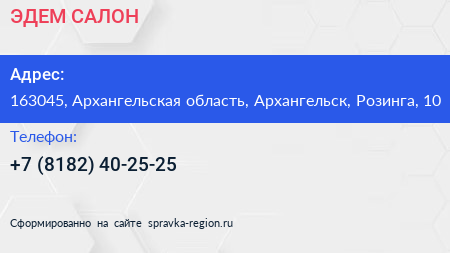 ЭДЕМ-САЛОН по адресу 163045, Архангельская область, Архангельск, Розинга, 10 в дальнейшем Организация, размещена в следующих категориях: