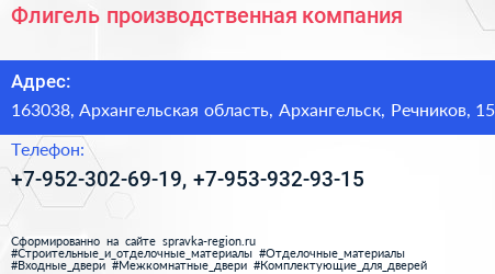Флигель, производственная компания по адресу 163038, Архангельская область, Архангельск, Речников, 15 в дальнейшем Организация, размещена в следующих категориях: